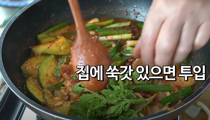국물이 졸여질때까지 뚜껑을 연 채로 약불에서 조려줍니다. 쑥갓이 있다면 쑥갓을 넣어주면 향긋하고 좋습니다.