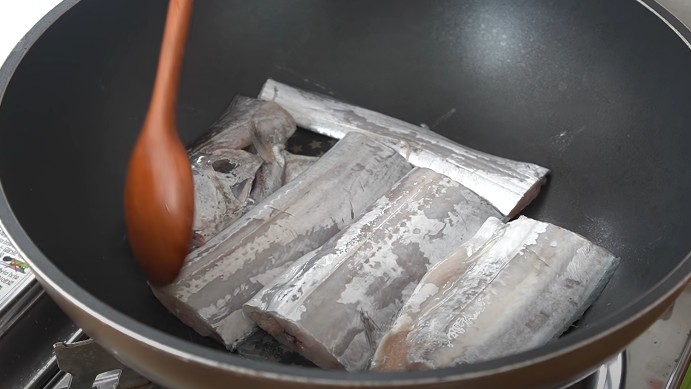 갈치에 밑간을 하면 살이 단단하게 쭉 밀려나옵니다. 간을 하지 않으면 부스러지기 쉽습니다.