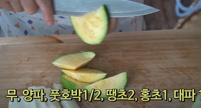 무는 1cm 두께로 자르고, 호박은 굵게 삐져줍니다. 갈치조림에 감자를 많이 넣는데요, 감자도 맛있지만 호박을 넣어도 참 맛있습니다. 호박과 갈치가 잘 어울려서 아주 맛있다고 합니다.
