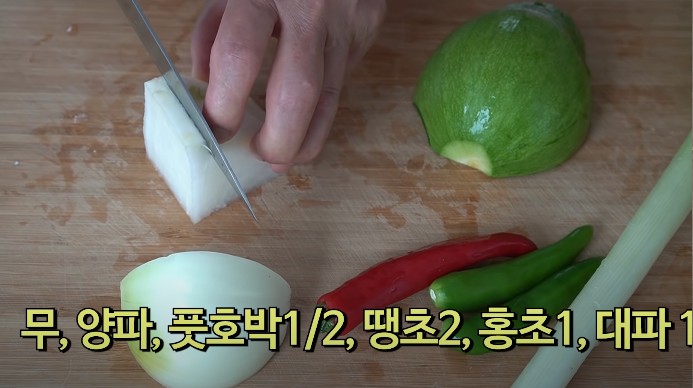 갈치조림에 부재료로 같이 넣을 야채들을 손질합니다. 무 한도막, 양파 1/2개, 풋호박 반개, 청양고추 2개, 홍고추 1개, 대파 1대 준비해서 잘라줍니다.