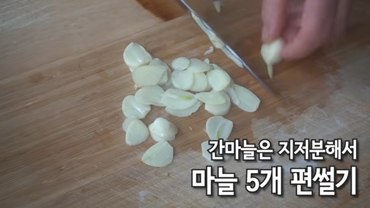 감자를 한 김 식히는 동안 마늘 5개를 얇게 편 썰어줍니다. 간 마늘을 넣으면 지저분해지니 이렇게 편 썰어서 넣어줍니다.