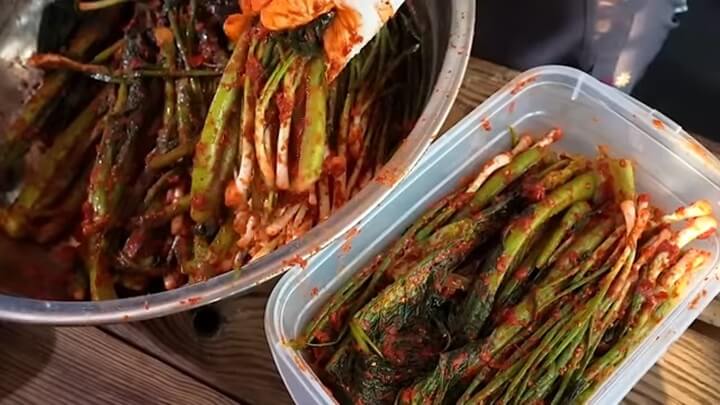 다 버무려서 완성된 갓김치와 파김치는 김치통에 담아주는데요, 갓 2~3 뿌리와 파 몇 뿌리 같이 담아서 끝을 모아준 다음 넣어주면 더욱 맛있습니다.