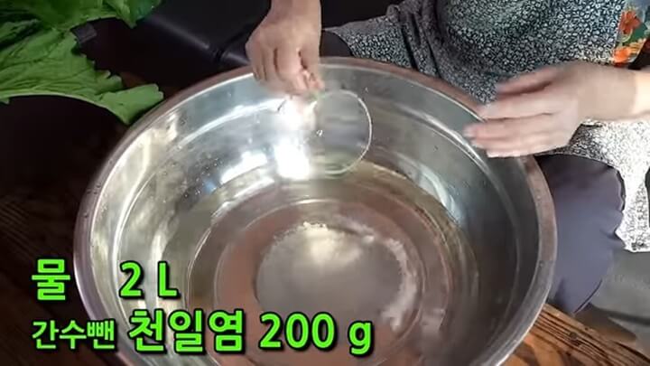 갓은 소금 물간을 해줘야 숨이 잘 죽습니다. 물 2리터에 천일염 200g을 넣어 녹입니다.