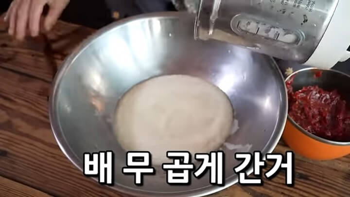 배와 무를 믹서기에 곱게 갈아서 담고, 찹쌀풀을 부어줍니다. 찹쌀풀은 찹쌀가루 2 숟갈에 물을 넣고 쑤어주면 되고, 찹쌀가루 대신 찬밥 3 숟갈을 넣고 쑤어도 됩니다.