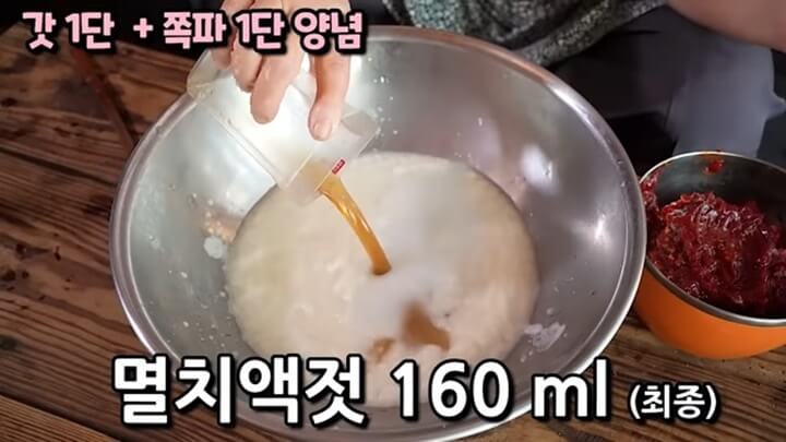 멸치액젓 160ml를 넣고, 간 마늘 3 숟갈, 생강(청) 1 숟갈도 넣어줍니다.