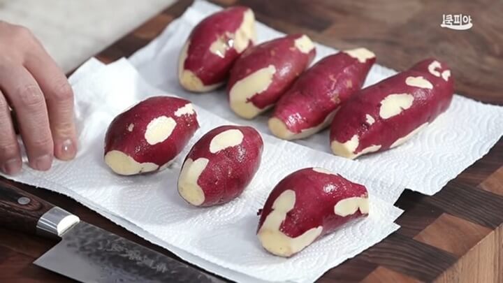 기름에 튀겨야 하는 고구마 맛탕은 물기가 있으면 기름이 튀어 데일 위험이 있습니다. 따라서 물기를 완전히 제거해 줍니다.  키친 타올로 물기를 완전히 닦아줍니다.
