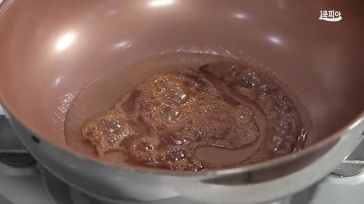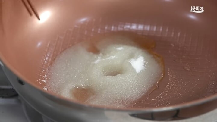 설탕과 식용유가 다 녹고 노릇노릇하게 되면 불을 끕니다.