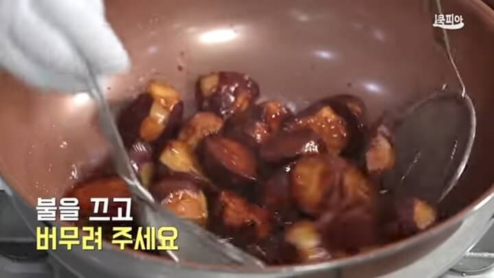 완성된 시럽에 고구마를 모두 넣고 버무려 줍니다. 불을 끄고 버무려야 타지 않습니다.