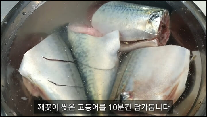 고등어를 깨끗하게 씻은 후 물에 식초를 타서 고등어를 담가둡니다. 비린내 제거를 위해 식초물에 10분 정도 담가 두면 됩니다.