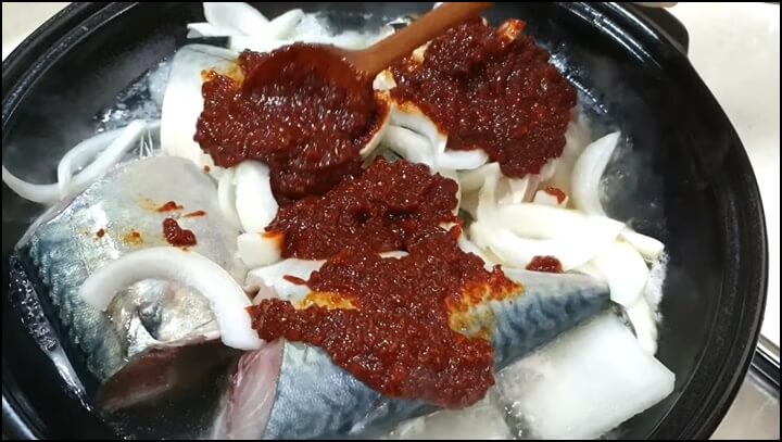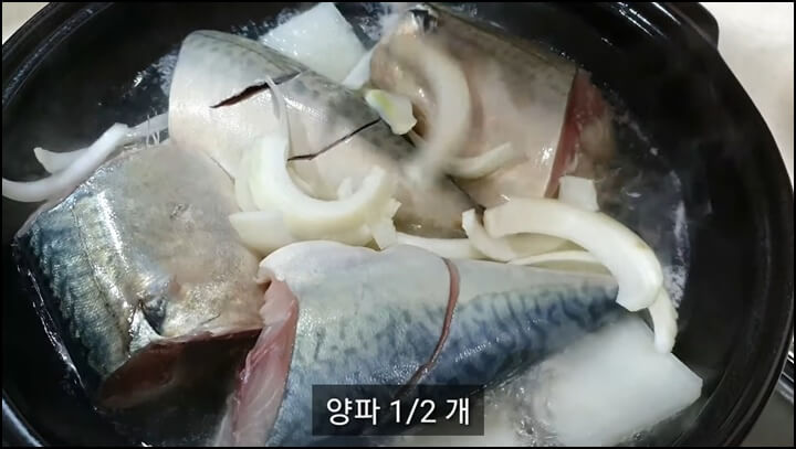 물이 팔팔 끓을 때 생고등어 2마리를 넣어줍니다. 양파 1/2개를 넣고, 양념장을 얹어줍니다.