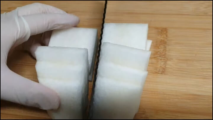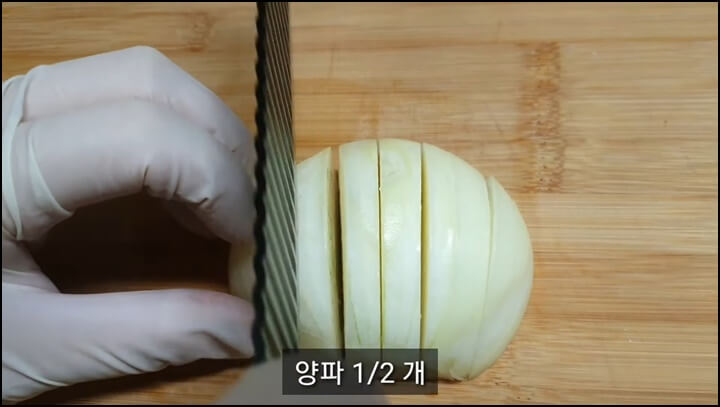 무 1토막을 적당한 두께와 크기로 잘라줍니다. 양파 반개도 굵게 채 썰어주고, 대파 1대는 적당한 길이로 자른 후 반으로 갈라줍니다. 청양고추 2개와 홍고추 1개는 어슷 썰어 줍니다.