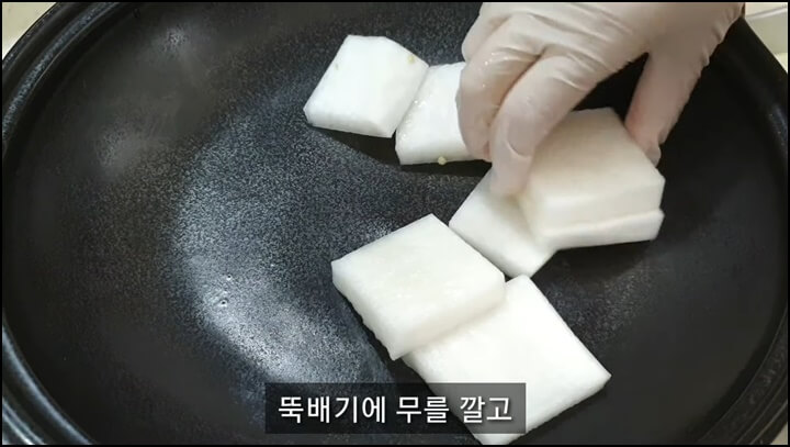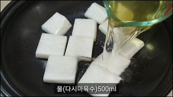 뚝배기에 무를 깔고 물이나 다시마 육수 500ml를 부어줍니다. 뚜껑을 덮어서 센 불에서 5분 정도 끓여줍니다.