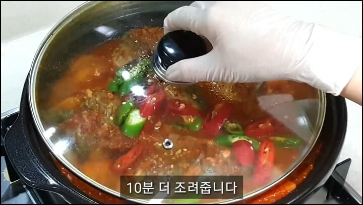 청양고추, 홍고추 썰어 둔 것을 올려주고, 뚜껑 덮어 10분간 더 조려줍니다.
