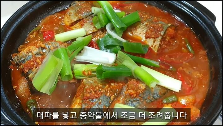 그런 다음 대파를 넣고 중약불에서 조금 더 조려줍니다. 그러면 맛있는 고등어 무조림 완성입니다.