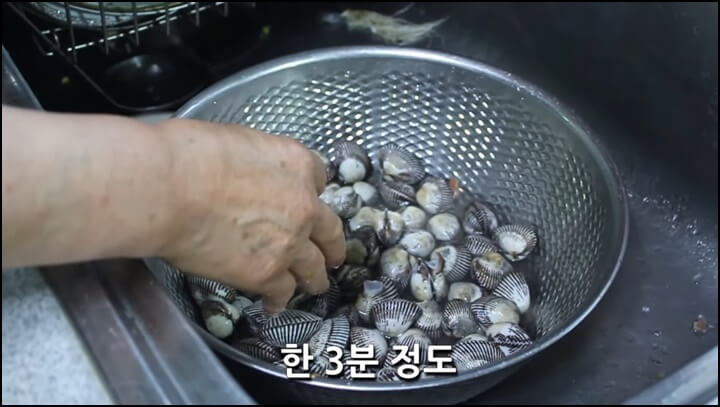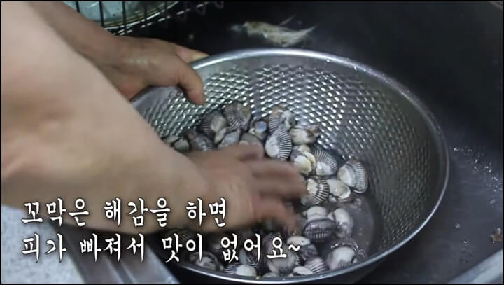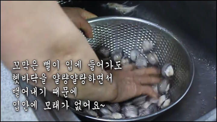 뽀얗게 잘 씻어줘야 물이 고소하니 꼬막은 깨끗하게 씻어줍니다.