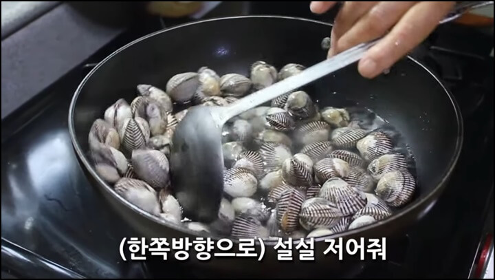 물이 팔팔 끓을 때 꼬막을 부어줍니다. 불은 센 불로 하고 국자로 꼬막을 살살 저어줍니다. 한쪽 방향으로 살살 저어주면 됩니다.