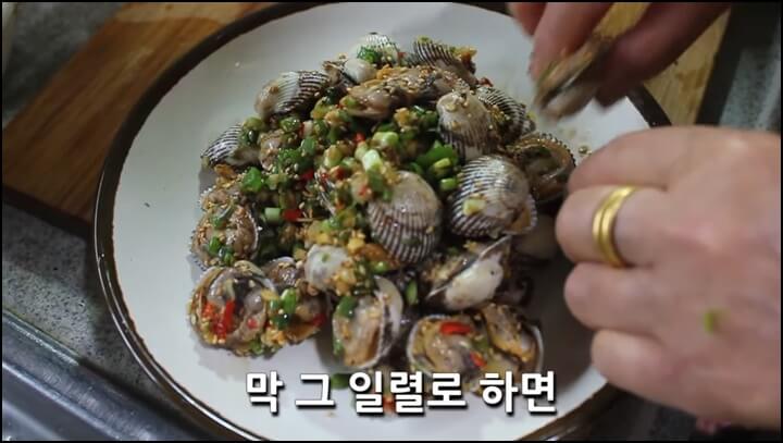 꼬막 하나하나에 양념장을 올리면 번거롭기도 하지만 꼬막이 짜게 되고, 이렇게 손으로 버무리며 껍질과 속살에 고루고루 양념이 묻도록 무쳐주면 오히려 보기도 좋고 맛도 더 좋습니다.