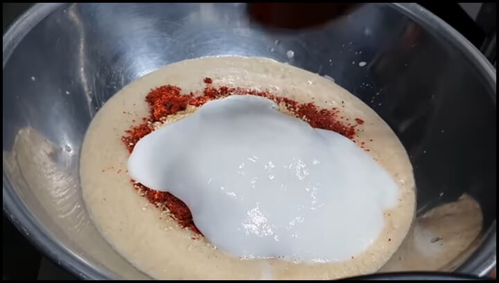 믹서에 잘 갈아준 다음 그릇에 부어줍니다. 고춧가루 200g을 넣고, 매실액 3스푼, 설탕 2스푼, 깨소금 2스푼, 그리고 찹쌀풀 쑨 것도 모두 넣어줍니다. 양념을 골고루 잘 섞어줍니다.