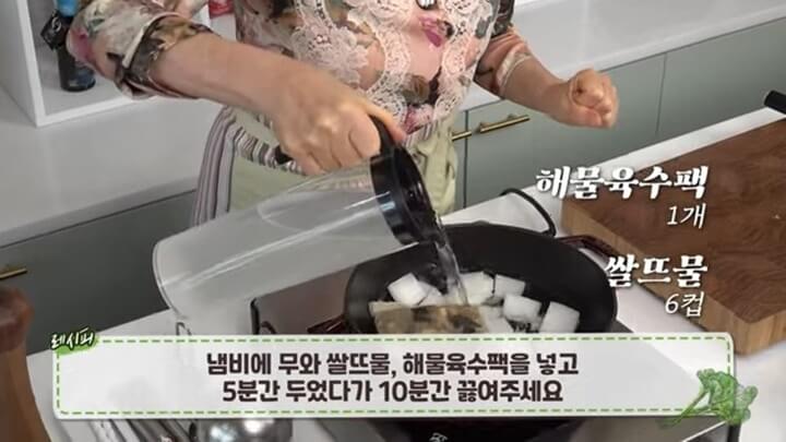 냄비에 썰어 둔 무를 넣고, 쌀뜨물 6컵, 해물 육수 팩 1개를 넣은 후 5분간 그대로 두었다가 끓여줍니다. 10분 정도 끓여주면 돼요.