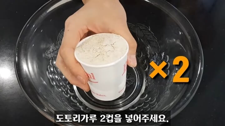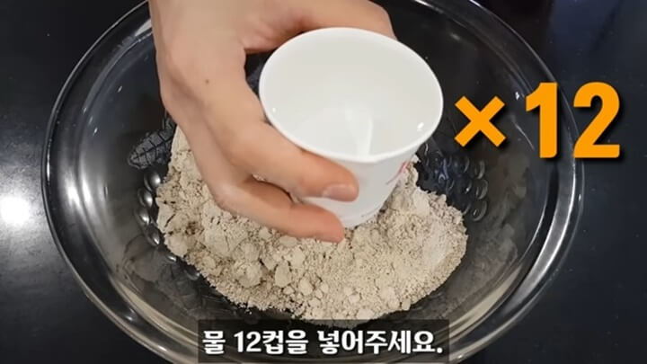 도토리가루를 2컵 넣어줍니다. 물은 12컵을 넣어줍니다. 물도 같은 컵으로 계량하시면 됩니다.
