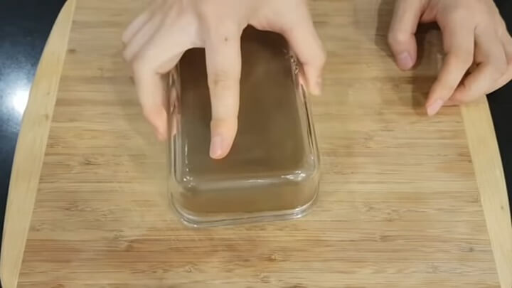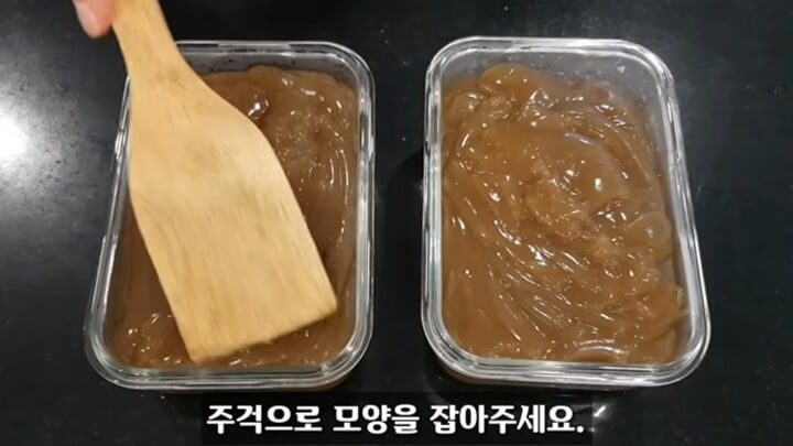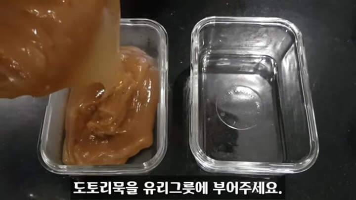 도토리묵을 굳힐 밀폐용기를 준비해서 도토리묵을 부어줍니다. 주걱이나 숟가락으로 윗면을 다듬어서 모양을 잡아줍니다.