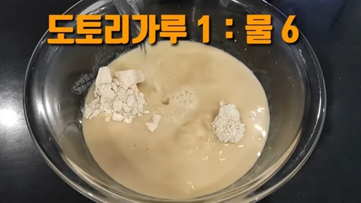 도토리가루와 물의 비율은 1 : 6 으로 맞춰주면 됩니다. 1:6 비율만 기억하시면 도토리묵 만드는법은 아주 쉽고 간단합니다.