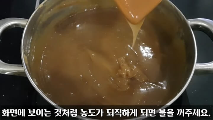 30분 정도 끓이니 농도가 되직하게 되면서 뚝뚝 끊어지듯 떨어지게 되는데 이때쯤 불을 끄면 됩니다. 그리고 뚜껑을 닫아 10분간 뜸을 들여줍니다.