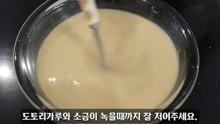 거품기를 이용해서 도토리가루와 소금이 녹을 때까지 잘 저어줍니다.