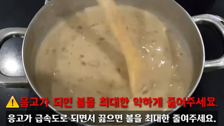 끓이면서 젓다보면 도토리가루가 응고되기 시작하는데요, 이때 불을 최대한 약하게 줄여줍니다. 응고가 급속도로 된다고 하니 불 조절 잘하셔야 되겠습니다.