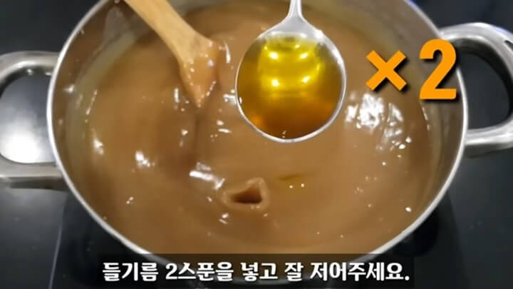 뭉쳐지기 시작하면 들기름 2스푼을 넣고 계속 저어줍니다. 달라붙거나 타는 것을 방지하기 위해 기름을 넣어주는 것이기 때문에 들기름 대신 참기름이나 식용유를 넣어도 괜찮습니다.