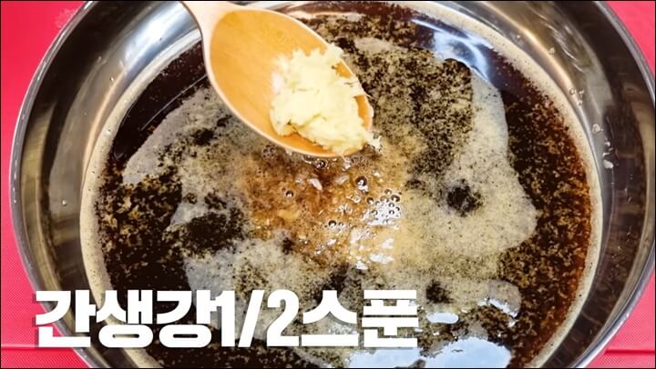 겨자 풀은 것을 양념에 넣고, 간 마늘 1스푼, 간 생강 1/2스푼을 넣고 골고루 저어줍니다. 이렇게 하면 돼지갈비찜 맛있게 만드는 법의 맛있는 양념이 완성되었어요.