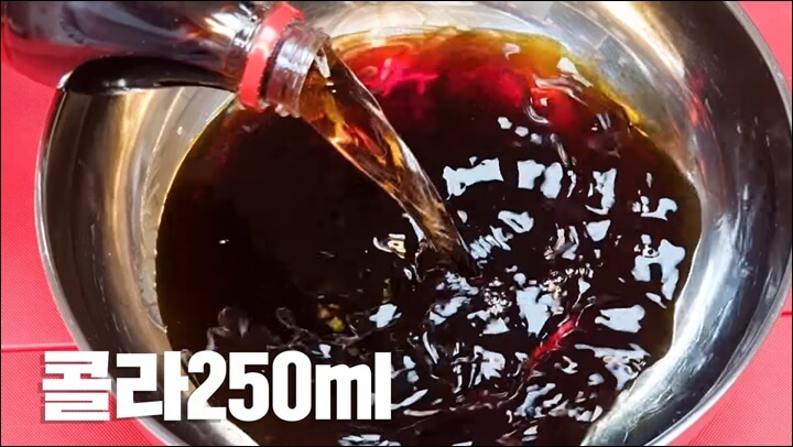 그리고 콜라 250ml를 넣어줍니다. 콜라를 넣어주면 돼지고기 특유의 냄새를 잡아줄 수 있다고 해요.