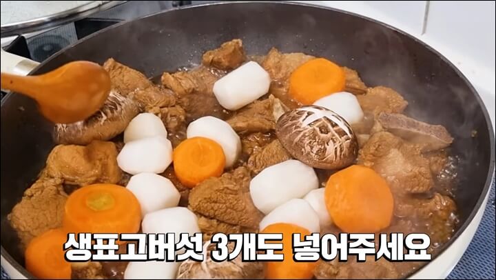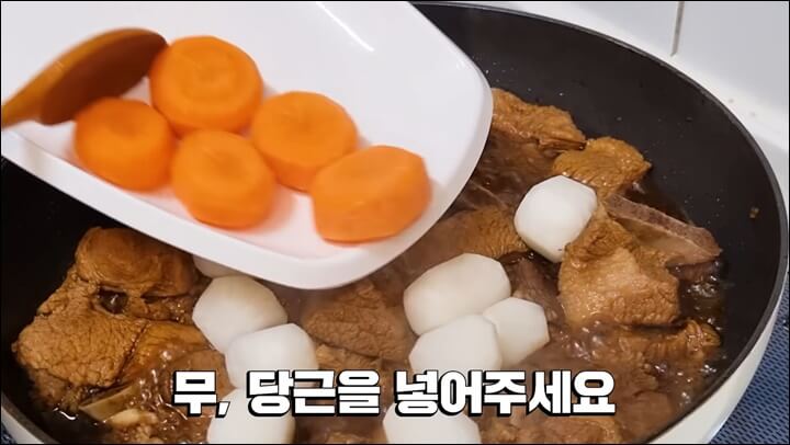 돼지갈비를 30분 정도 끓이고 나면 물이 적당히 졸아있어요. 한번 뒤집어 준 다음 무와 당근을 넣어주고, 표고버섯도 같이 넣어줍니다.