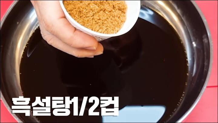 돼지갈비찜 맛있게 만드는 법에 필요한 양념장을 만들어요. 진간장 1컵 160ml, 소주 종이컵 반컵, 콜라 250ml, 흑설탕 종이컵 반 컵을 넣고 살짝 저어줍니다.
