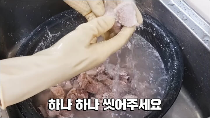 돼지갈비찜 맛있게 만드는 법 첫 번째는 돼지갈비를 깨끗이 손질하는 것이에요. 먼저 돼지갈비를 깨끗이 씻어줍니다. 보통 핏물을 빼고 만들곤 했지만 요즘은 따로 핏물 뺄 필요 없이 두 번 정도 깨끗이 씻어주면 된다고 해요. 그리고 초벌로 삶아서 사용할 거라서 굳이 핏물을 뺄 필요는 없어요.