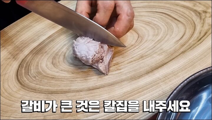 깨끗이 씻은 후 돼지갈비가 큰 것은 칼집을 내주도록 합니다. 그래야 질기지 않게 먹을 수 있어요.