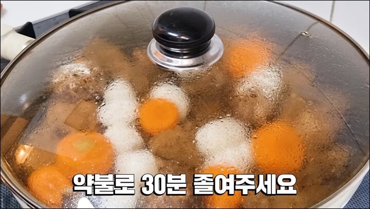 뚜껑을 닫아 약불로 줄여서 30분 정도 뭉근하게 졸여줍니다. 이렇게 약불로 뭉근히 졸여주면 돼지갈비가 연하고 맛있어져요.