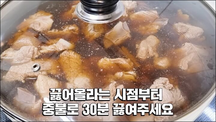 물을 넣은 후 뚜껑을 닫고 끓여주는데, 물이 끓어 올라오는 시점부터 중불로 해서 30분을 끓여줍니다. 강불로 해서 끓이게 되면 돼지갈비가 질겨지니 꼭 중불로 해서 끓여주세요.