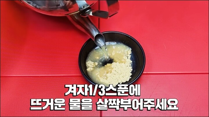 그리고 오늘의 핵심포인트!! 돼지갈비찜 맛있게 만드는 법의 핵심 양념이라고 할 수 있는 겨자를 준비합니다. 겨자 1/3스푼에 뜨거운 물을 살짝 부어서 겨자를 녹여주세요. 겨자를 넣으면 돼지고기의 잡내를 잡아주고 풍미가 확 살아난다고 해요. 가루 겨자가 없다면 연겨자를 사용해도 좋아요.