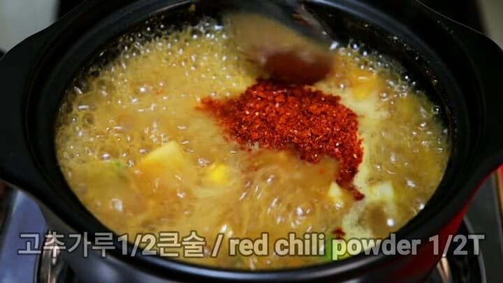 국물이 끓어오르면 된장찌개 맛있게 끓이는 방법 두 번째 비법인 청국장 2/3큰술을 넣어줍니다.  청국장찌개 끓일 때 일반 된장을 같이 넣어주는 것은 많이 보았지만, 일반 된장찌개 끓일 때 청국장을 넣어주는 건 생각도 못했는데 새로운 방법이네요!