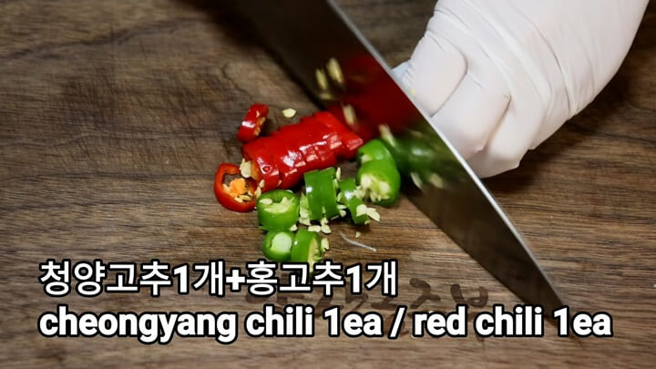 여기서는 깍둑썰기, 네모 썰기로 통일했어요. 호박, 무, 양파, 두부를 비슷한 크기로 네모 썰기 하고, 달래와 팽이버섯은 적당한 길이로 썰어주어요. 홍고추와 청양고추, 대파는 쫑쫑 썰어주면 됩니다.