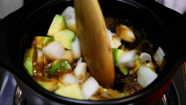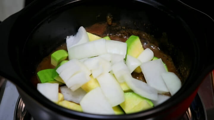 1분간 된장을 볶은 후 썰어두었던 야채 중 호박, 무, 양파를 넣고 다시 1분간 달달 볶아줍니다. 이렇게 야채를 된장과 함께 볶아주게 되면 야채들에도 된장의 맛이 배게 되어 야채가 밍밍하지 않고 된장의 구수함이 입혀지게 돼요.