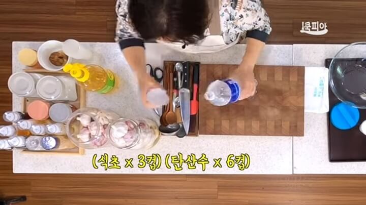 그건 바로 일반 양조식초와 탄산수를 섞어서 만드는 방법인데요, 종이컵 200cc 컵으로 마늘 반접 기준 식초 6컵에 탄산수 12컵으로 식초: 탄산수 1:2 비율의 촛물을 만들어 줍니다.