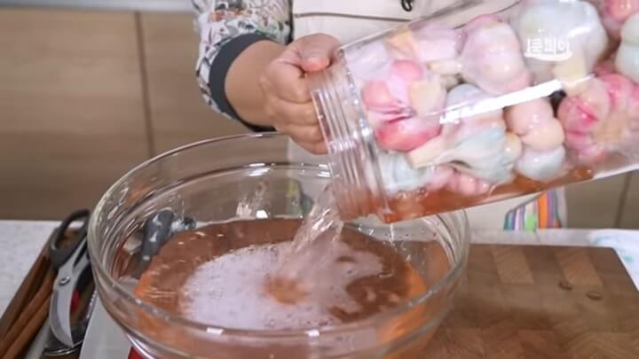 이틀을 촛물에 절인 통마늘은 절임물을 따로 그릇에 부어냅니다. 촛물이 불그스름하게 물들었는데 이는 마늘 껍질의 붉은 것이 우러나서 그런 거예요.