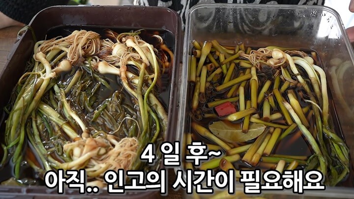 4일 정도 지난 후 마늘쫑장아찌와 달래장아찌의 모습이에요. 아직 더 익어야 하지만 일주일 정도 뒤부터 먹을 수 있어요.