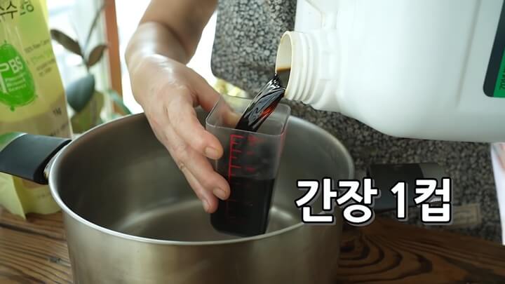 그런 다음 마늘쫑은 약간 짭조름해야 하고 또 오래 먹어야 하니 간장을 조금 더 추가해서 짜게 만들어줍니다. 간장 100ml를 추가로 넣어줍니다.