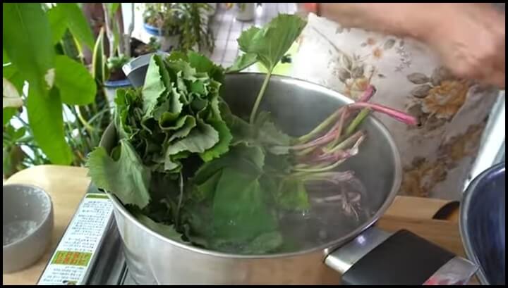 냄비에 물이 끓으면 천일염 한 주먹 넣어주고, 머위의 뿌리 부분부터 물에 넣어줍니다. 머위대가 푹 익을 때까지 삶아지면 되고, 초록 나물은 뚜껑을 열고 삶아야 색이 변하지 않습니다. 뚜껑을 닫고 삶으면 초록색이던 이파리가 누렇게 변합니다.