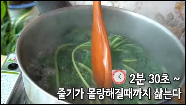 줄기가 말랑해질 때까지 삶아주면 되고, 손으로 줄기를 눌러보아 말랑해지면 꺼냅니다.