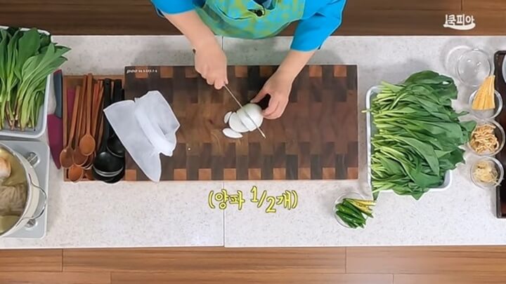 다시팩에 양파 반개를 굵게 채 썰어서 넣어줍니다. 양파를 이렇게 썰어서 넣어주면 단맛이 훨씬 더 잘 우러납니다. 단맛이 많이 우러나면 설탕 양을 그만큼 줄일 수 있어 좋습니다.