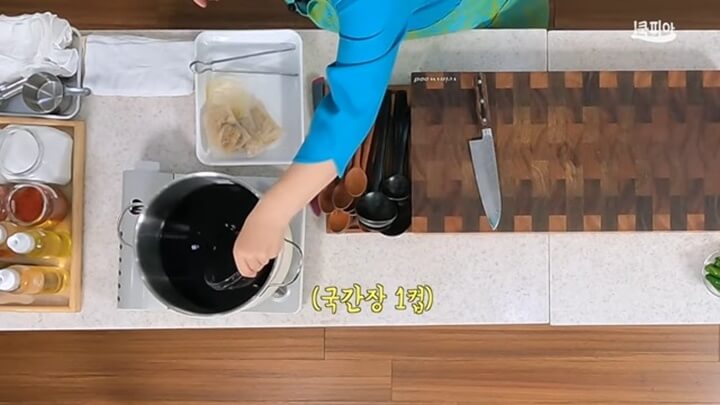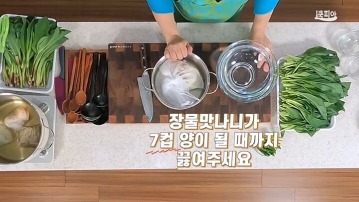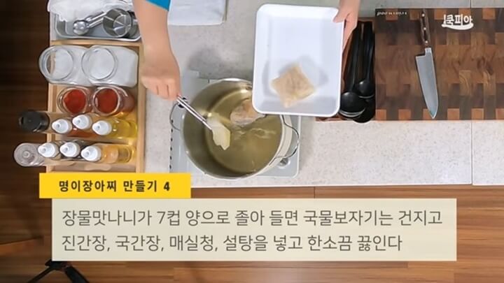 다시팩을 냄비에 넣고, 물 8컵(1.6리터)을 부어서 끓여주는데, 장물맛나니가 7컵이 나오도록 끓여줍니다. 이렇게 만들면 장물이 단맛이 우러나면서 아주 담백하고 깊은 맛이 납니다.
